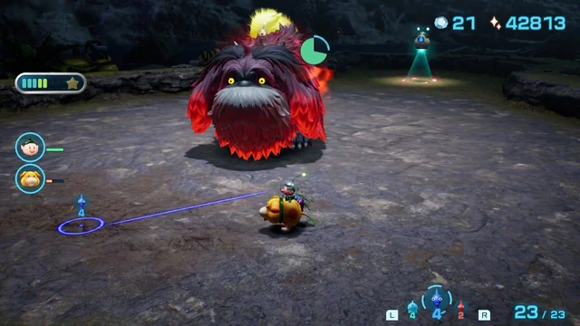 In this phase, the boss will start by throwing two or three fire-furballs around itself, as well as shooting fireballs. While the furballs don't pose much of a threat on their own, when it uses its next attack, which is a stomp, creating an expanding fiery ring around itself, they will explode if the ring comes into contact with them, creating another ring of fire. This can be difficult to dodge, so it's best to eliminate them with Red Pikmin or Oatchi's Rush (which is now less risky) as soon as possible. When it uses the stop attack, navigate around to its backside (preferably on Oatchi to jump over the rings), and throw Pikmin onto its tail. Attack its belly and prepare for the final phase by going as far away from the boss as possible.