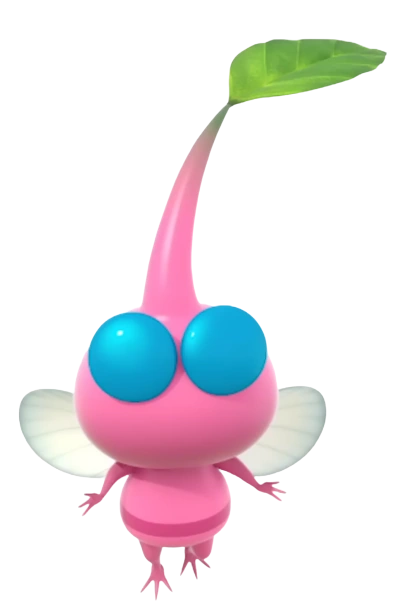 Winged Pikmin are a species of Pikmin discovered in Pikmin 3. Their bodies are a vivid pink color with bee-like markings. They have very large heads, small arms and legs, two large blue compound eyes, which are actually crystalline "goggles", and very small transparent wings. Upon maturing, they sport a lavender flower (identical in color to that of a Rock Pikmin's), and have a decent resemblance to White Pikmin.